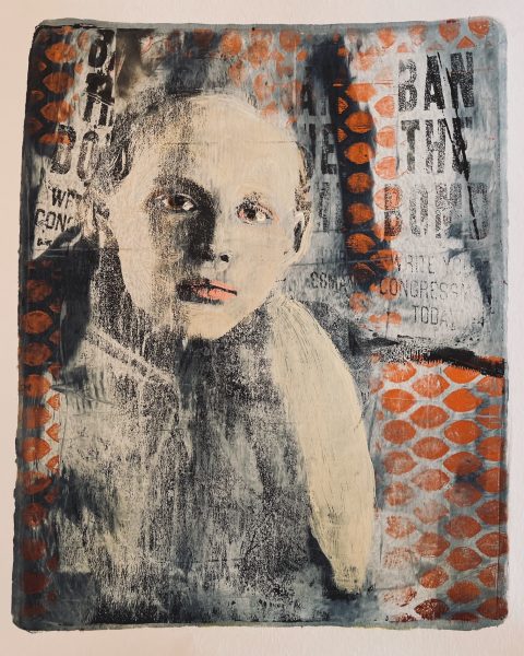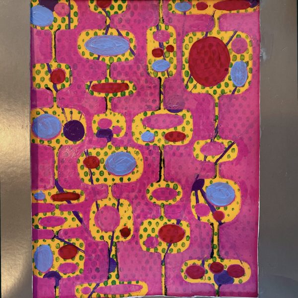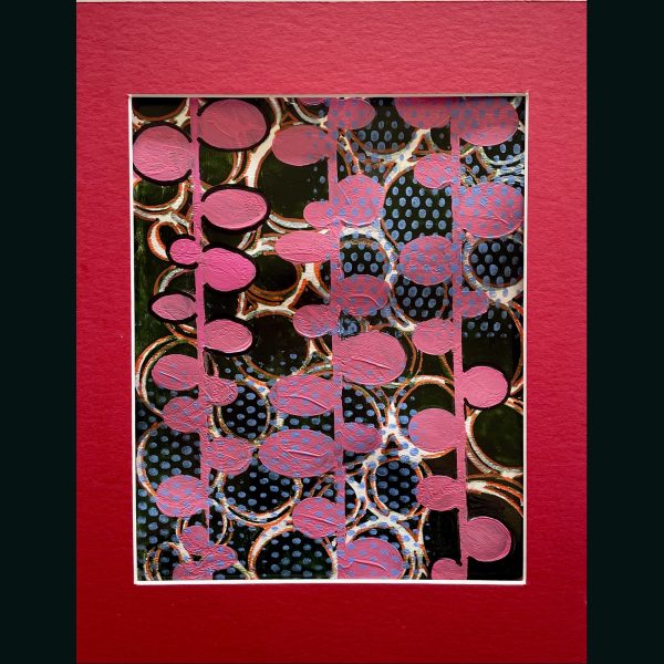 Gelli Plate printing is a process that produces a one of a kind print. The printmaker can use various water based media (paints and markers) with stencils, and printed ink sheet transfers in layers on top of the Silicon printing plate to create the artist’s unique image. The “pull” is a one of a kind print.